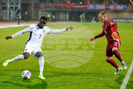 England's Bukayo Saka in action during the 2026 World Cup group K qualifying soccer match between Latvia and England in Riga, Latvia, Tuesday, Oct. 14, 2025. (AP Photo/Roman Koksarov)