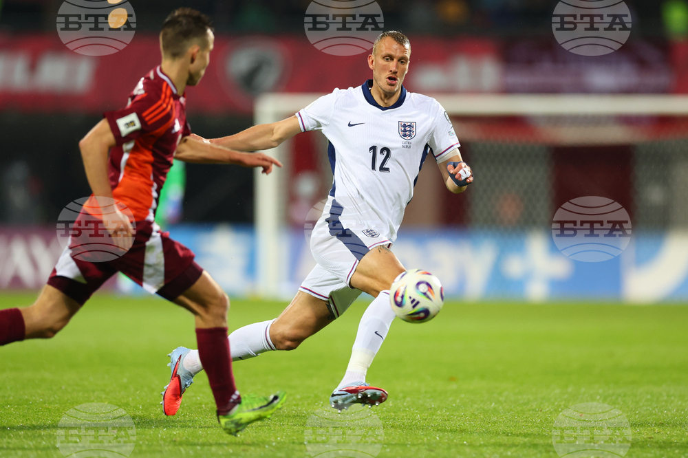 England's John Stones, right, challenges for the ball with Latvia's Roberts Veips during the 2026 World Cup group K qualifying soccer match between Latvia and England in Riga, Latvia, Tuesday, Oct. 14, 2025. (AP Photo/Roman Koksarov)
