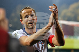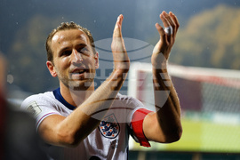 England's Harry Kane applauds England's travelling support after the 2026 World Cup group K qualifying soccer match between Latvia and England in Riga, Latvia, Tuesday, Oct. 14, 2025. (AP Photo/Mindaugas Kulbis)