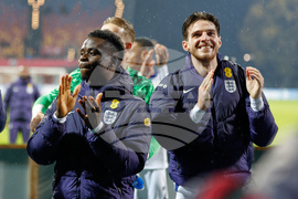 England players celebrate their victory at the 2026 World Cup group K qualifying soccer match between Latvia and England in Riga, Latvia, Tuesday, Oct. 14, 2025. (AP Photo/Roman Koksarov)