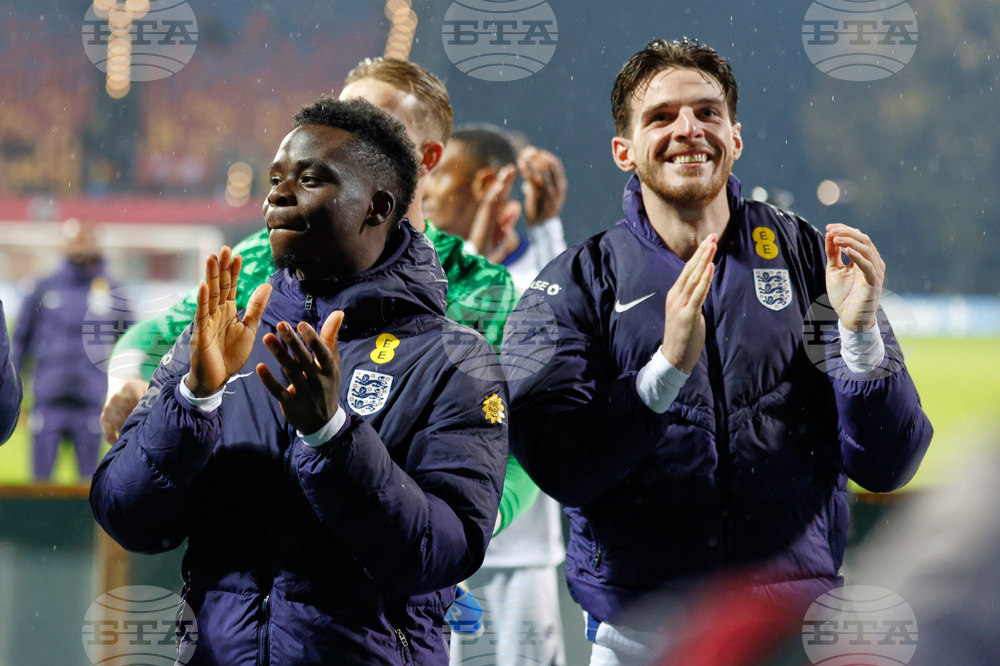 England's Bukayo Saka, left, and Declan Rice applaud England's travelling support after the 2026 World Cup group K qualifying soccer match between Latvia and England in Riga, Latvia, Tuesday, Oct. 14, 2025. (AP Photo/Mindaugas Kulbis)