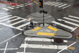 As rain falls, a pedestrian crosses Sutter Street at Stockton Street in San Francisco on Monday, Oct. 13, 2025. (Scott Strazzante/San Francisco Chronicle via AP)