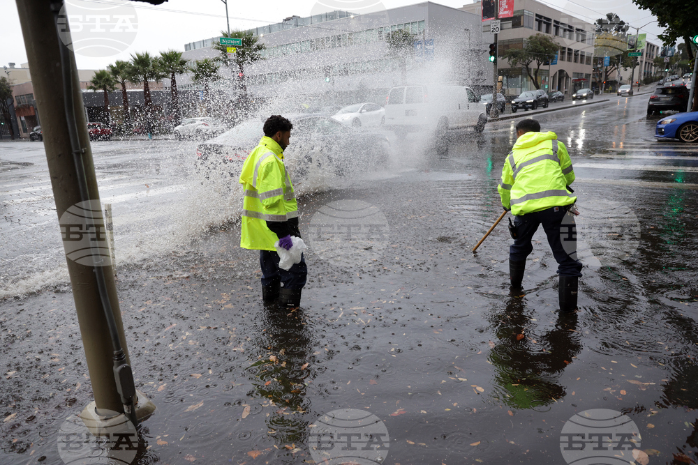 UCSF Medical Center's Andrew Abuyaghi and David Drongpa work on clearing a clogged sewer grate, after heavy rainfall, in San Francisco on Monday, Oct. 13, 2025. (Scott Strazzante/San Francisco Chronicle via AP)