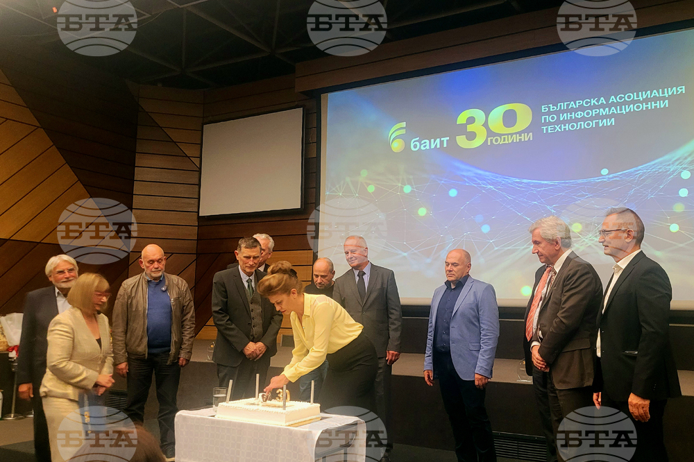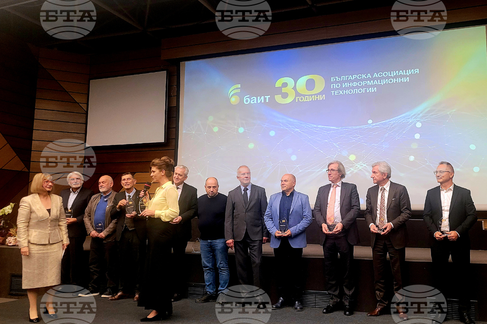 София (14 октомври 2025) Българската асоциация по информационни технологии отбеляза тази вечер 30-годишнината си. Организацията награди всички свои 12 председатели с плакет за приноса им в развитието на БАИТ. На снимката (от ляво надясно) изпълнителният директор на БАИТ Весела Калъчева и настоящият председател на асоциацията Ирина Радоева. Наградените председатели през годините (от ляво надясно): Николай Илиев, Йордан Кисьов, Милчо Боров, Васил Василев, Златко Златков, Боян Бойчев, Теодор Захов, Петър Иванов, Огнян Траянов, Светозар Илиев. Плакета за Васил Христович получи Ирина Радоева.