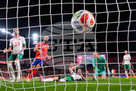 Bulgaria's Atanas Chernev, center, scores an own goal during the World Cup 2026 group E qualifying soccer match between Spain and Bulgaria in Valladolid, Spain, Tuesday, Oct. 14, 2025. (AP Photo/Manu Fernandez)