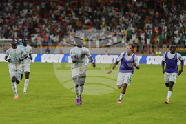 Senegal's Malick Diouf celebrates with fans after their team's victory in a World Cup qualifying soccer match against Mauritania at Abdoulaye Wade in Dakar, Senegal, Tuesday, Oct. 14, 2025. (AP Photo/Misper Apawu)