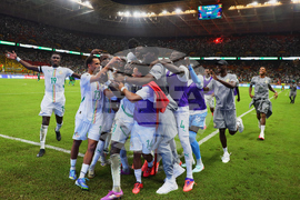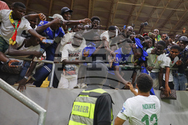 Senegal's Lamine Ndiaye celebrates with fans after their team's victory in a World Cup qualifying soccer match against Mauritania at Abdoulaye Wade in Dakar, Senegal, Tuesday, Oct. 14, 2025. (AP Photo/Misper Apawu)