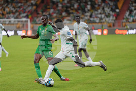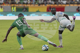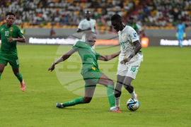 Senegal's Ismaïla Sarr, right, challenges for the ball with Mauritania's Bakari Camara, left, during a World Cup Group B qualifying soccer match between Senegal and Mauritania at the Stade Abdoulaye Wade in Dakar, Senegal, Tuesday, Oct. 14, 2025. (AP Photo/Misper Apawu)