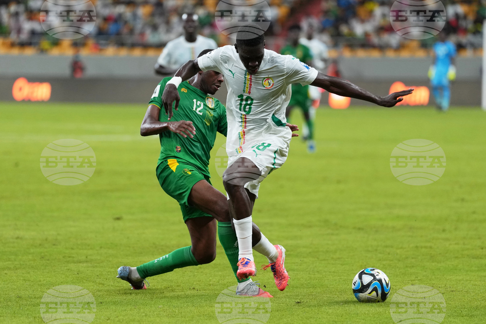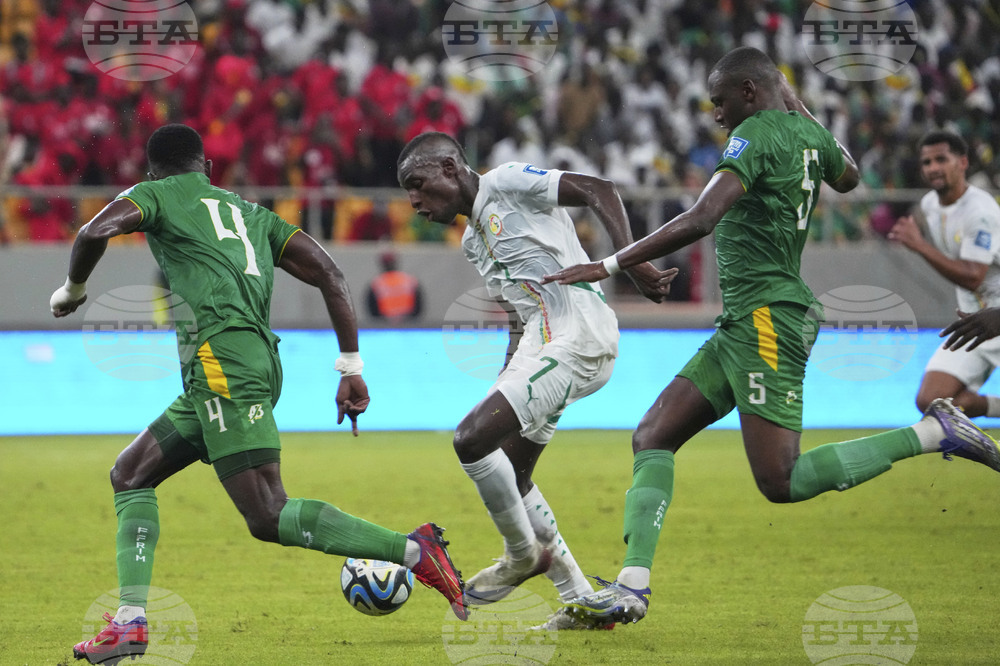 (Senegal's Nicolas Jackson, center, fights for the ball with Mauritania defenders during a World Cup qualifying soccer match at Abdoulaye Wade in Dakar, Senegal, Tuesday, Oct. 14, 2025. (AP Photo/Misper Apawu)