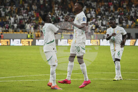 A Senegal's supporter cheer ahead of a World Cup Group B qualifying soccer match between Senegal and Mauritania at the Stade Abdoulaye Wade in Dakar, Senegal, Tuesday, Oct. 14, 2025. (AP Photo/Misper Apawu)