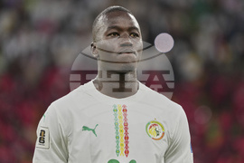 Senegal's Pape Gueye stands during the playing of his country's national anthem during a World Cup qualifying soccer match against Mauritania at Stade Abdoulaye Wade in Dakar, Senegal, Tuesday, Oct. 14, 2025. (AP Photo/Misper Apawu)