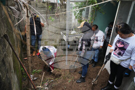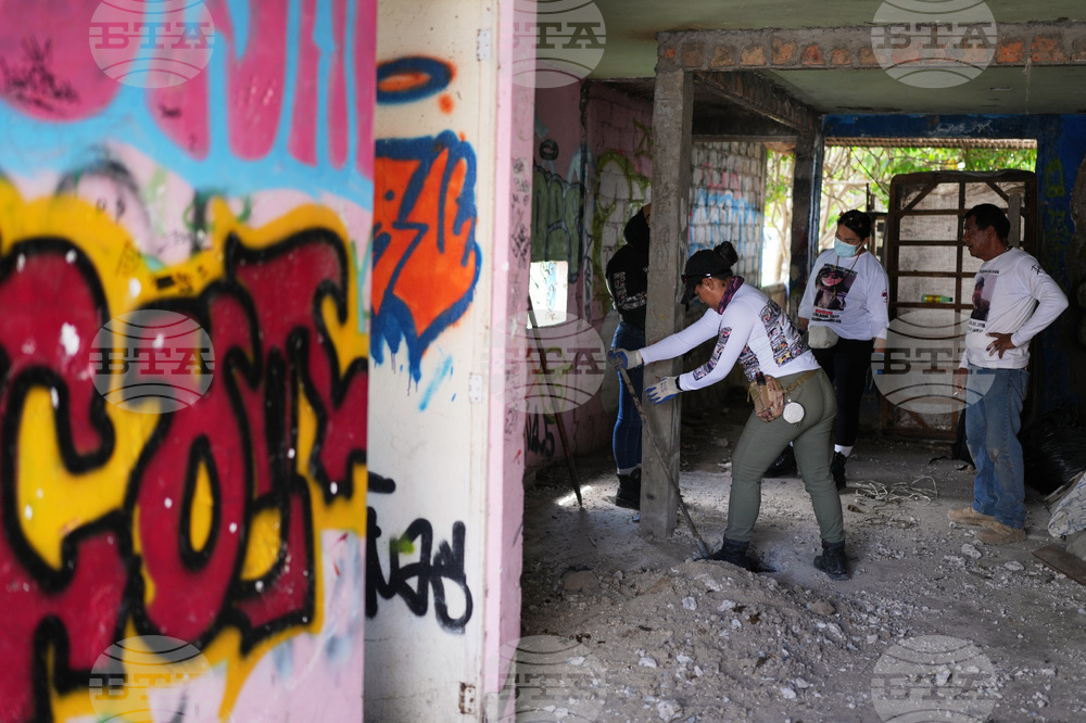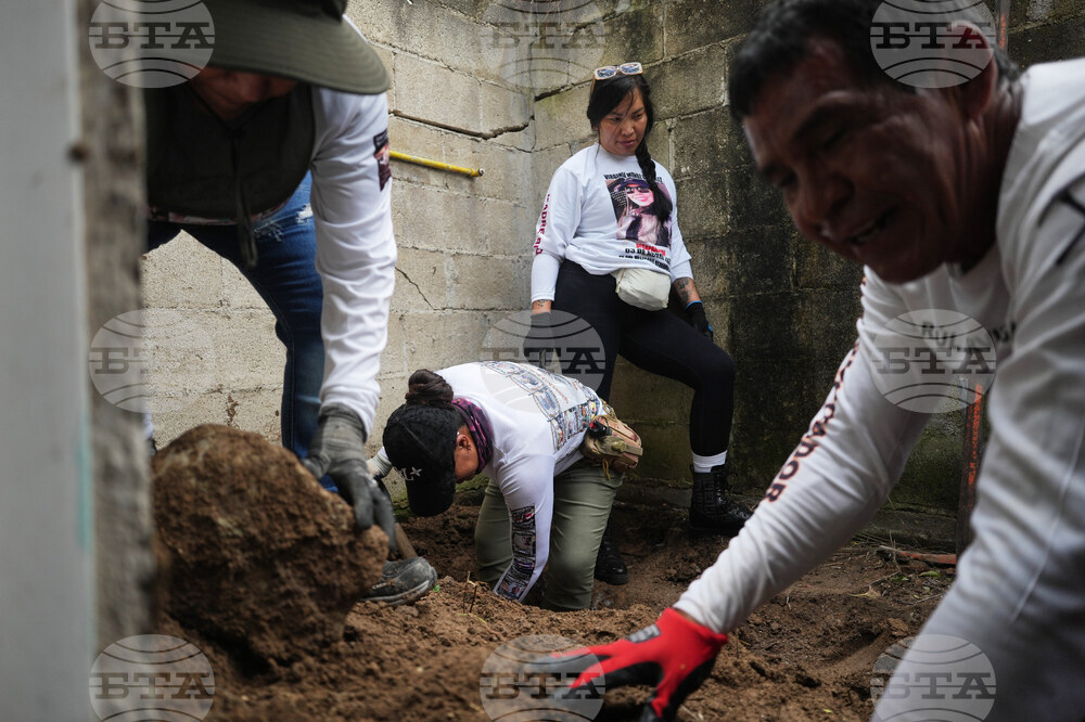 Relatives of missing people, part of a group called the Guerreros Buscadores, inspect an area where they suspect bodies may be buried, in the Valle de los Olivos neighborhood of Guadalajara, Mexico, Tuesday, Oct. 14, 2025. (AP Photo/Eduardo Verdugo)