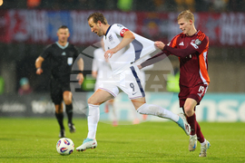 Latvia's Maksims Tonisevs, right, pulls the shirt of England's Harry Kane during the 2026 World Cup group K qualifying soccer match between Latvia and England in Riga, Latvia, Tuesday, Oct. 14, 2025. (AP Photo/Roman Koksarov)