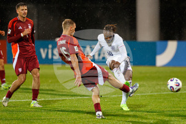 England's Eberechi Eze, right, scores his side's fifth goal during the 2026 World Cup group K qualifying soccer match between Latvia and England in Riga, Latvia, Tuesday, Oct. 14, 2025. (AP Photo/Mindaugas Kulbis)
