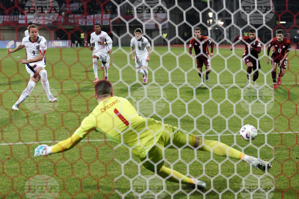 England's Harry Kane, left, scores on a penalty kick during the 2026 World Cup group K qualifying soccer match between Latvia and England in Riga, Latvia, Tuesday, Oct. 14, 2025. (AP Photo/Roman Koksarov)