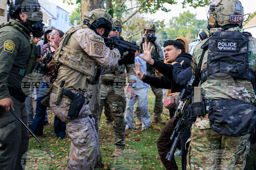 A law enforcement officer points a crowd control weapon at a protester in East Side, Chicago, Tuesday, Oct. 14, 2025. (Anthony Vazquez/Chicago Sun-Times via AP)