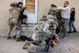 ICE agents detain a protester as other protesters try to stop them in East Side, Chicago, Tuesday, Oct. 14, 2025. (Anthony Vazquez/Chicago Sun-Times via AP)