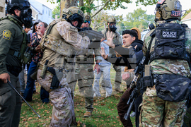 A law enforcement officer points a crowd control weapon at a protester in East Side, Chicago, Tuesday, Oct. 14, 2025. (Anthony Vazquez/Chicago Sun-Times via AP)
