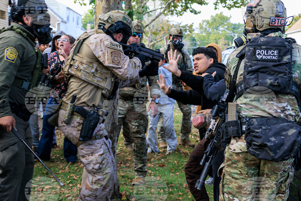 A U.S. Customs and Border Protection agent points a non-lethal weapon at protesters in East Side, Chicago, Tuesday, Oct. 14, 2025. (Anthony Vazquez/Chicago Sun-Times via AP)
