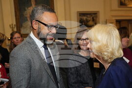 Queen Camilla, right, speaks with Ed Poultney during a reception to celebrate the centenary of BookTrust, at Clarence House, London, Tuesday, Oct. 14, 2025. (Aaron Chown/PA via AP, Pool)