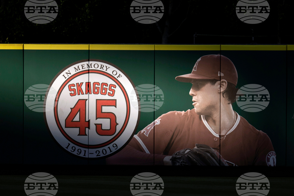 FILE - An image and logo memorializing former Los Angeles Angels pitcher Tyler Skaggs is displayed on the outfield wall in Anaheim, Calif., July 17, 2019. (AP Photo/Kyusung Gong, File)