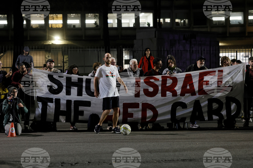 People protest against the participation of the Israeli national team in the 2026 Soccer World Cup qualification match against Italy being played in the evening in Rome, Italy, Tuesday, Oct. 14, 2025. (Cecilia Fabiano/LaPresse via AP)