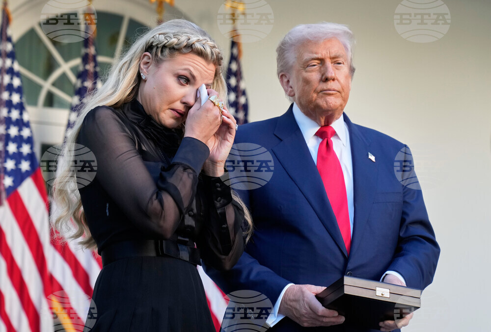 Erika Kirk reacts after President Donald Trump posthumously awarded the Presidential Medal of Freedom to her late husband Charlie Kirk, in the Rose Garden of the White House, Tuesday, Oct. 14, 2025, in Washington. (AP Photo/Mark Schiefelbein)