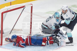 Montreal Canadiens' Lane Hutson (48) trips in the crease in front of Seattle Kraken goaltender Joey Daccord (35) and Ryan Lindgren (55) during the first period of an NHL hockey game in Montreal on Tuesday, Oct. 14, 2025. (Christinne Muschi/The Canadian Press via AP)