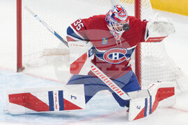 Montreal Canadiens goaltender Sam Montembeault (35) makes a save against the Seattle Kraken during the first period of an NHL hockey game in Montreal on Tuesday, Oct. 14, 2025. (Christinne Muschi/The Canadian Press via AP)