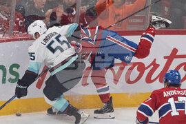 Montreal Canadiens' Jake Evans (71) is checked into the boards by Seattle Kraken's Ryan Lindgren (55) during first period NHL hockey action in Montreal on Tuesday, Oct. 14, 2025. (Christinne Muschi/The Canadian Press via AP)