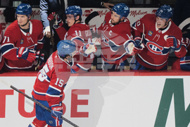 Montreal Canadiens' Alex Newhook (15) celebrates his goal against the Seattle Kraken with the bench during first period NHL hockey action in Montreal on Tuesday, Oct. 14, 2025. (Christinne Muschi/The Canadian Press via AP)