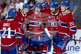 Montreal Canadiens' Cole Caufield (13) celebrates his goal over the Seattle Kraken with teammates from left to right Kaiden Guhle (21), Lane Hutson (48), Nick Suzuki (14) and Juraj Slafkovsky (20) during second period NHL hockey action in Montreal on Tuesday, Oct. 14, 2025. (Christinne Muschi/The Canadian Press via AP)