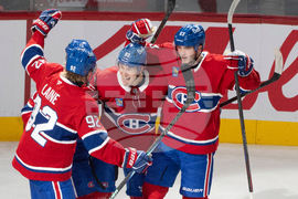 Montreal Canadiens' Cole Caufield (13) celebrates his game-winning goal with teammates Lane Hutson (48) and Nick Suzuki (14) during overtime NHL hockey against Seattle Kraken in Montreal on Tuesday, Oct. 14, 2025. (Christinne Muschi/The Canadian Press via AP)