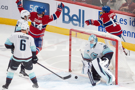 Montreal Canadiens' Cole Caufield (13) celebrates his game-winning goal on Seattle Kraken goaltender Joey Daccord (35) during overtime of an NHL hockey game in Montreal on Tuesday, Oct. 14, 2025. (Christinne Muschi/The Canadian Press via AP)