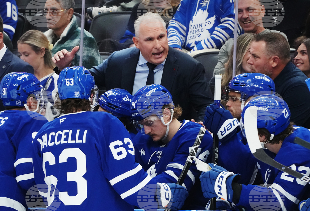 Toronto Maple Leafs head coach Craig Berube speaks with this players during a timeout in second period NHL hockey action against the Nashville Predators in Toronto on Tuesday, October 14, 2025. (Nathan Denette/The Canadian Press via AP)
