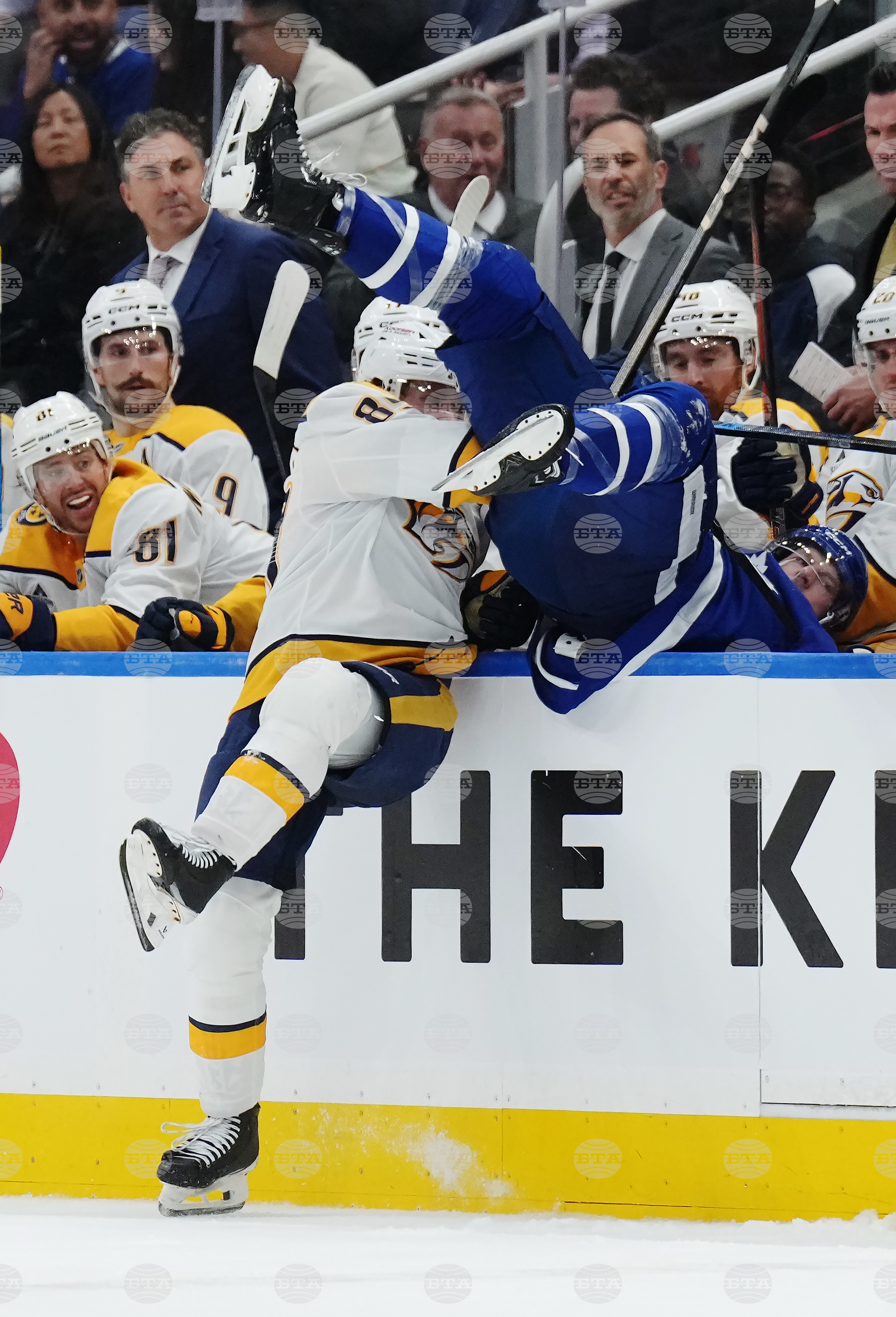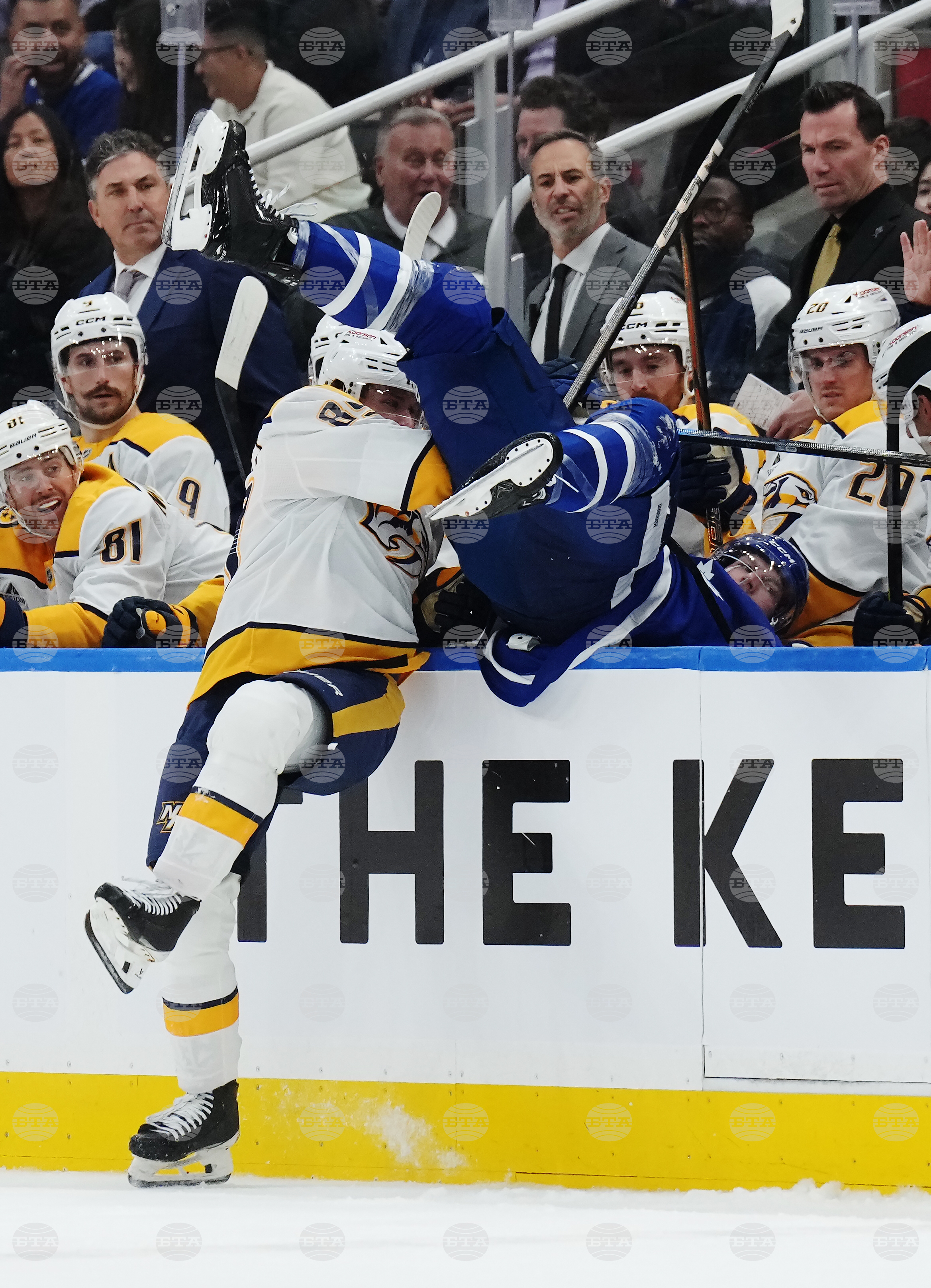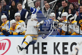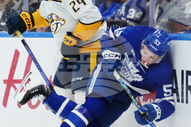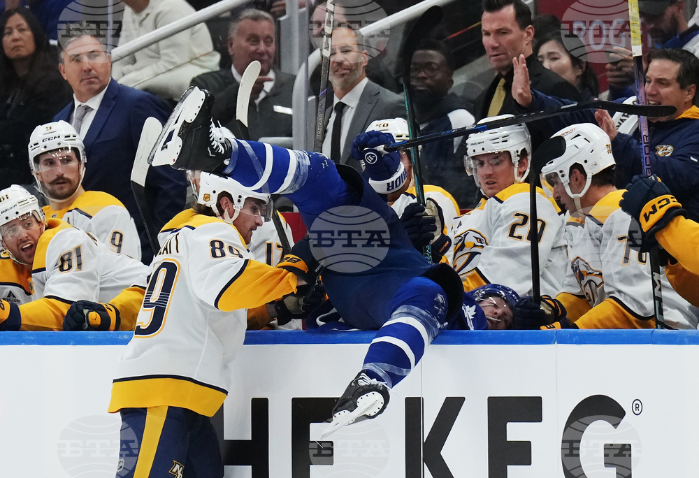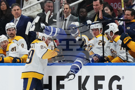 Nashville Predators' Ozzy Wiesblatt (89) hits Toronto Maple Leafs' Jake McCabe (22) into the Nashville bench during second period NHL hockey action in Toronto on Tuesday, Oct. 14, 2025. (Nathan Denette/The Canadian Press via AP)