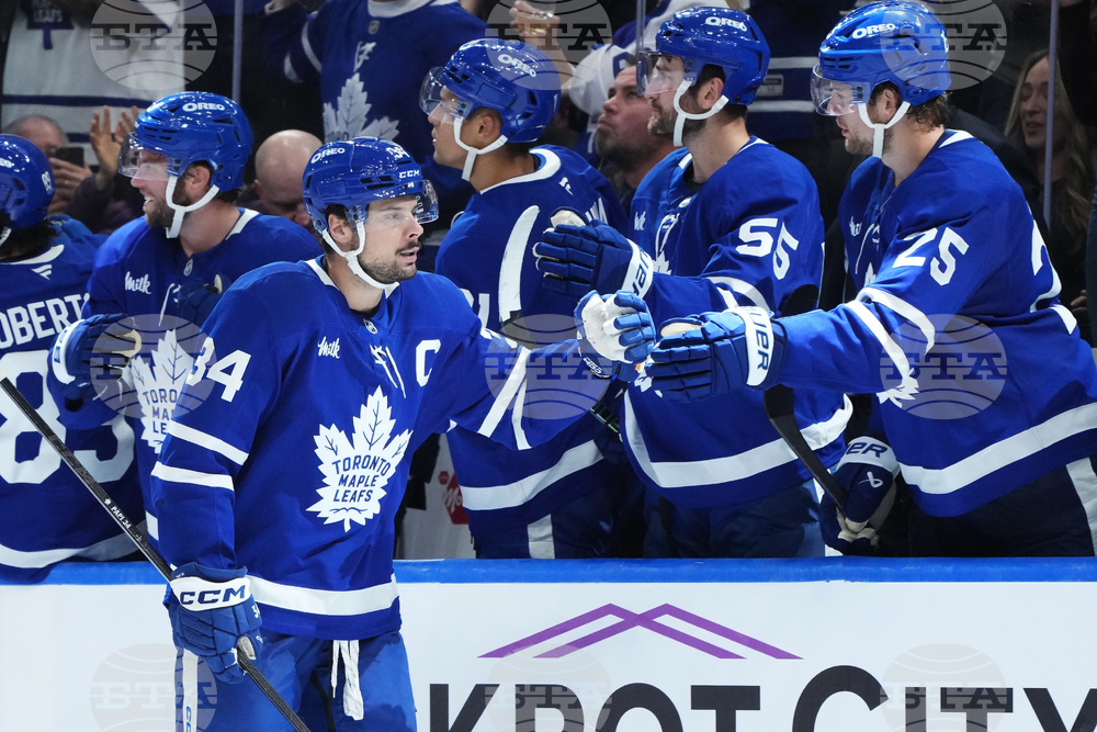 Toronto Maple Leafs' Auston Matthews (34) celebrates his goal against the Nashville Predators during third period NHL hockey action in Toronto on Tuesday, October 14, 2025. (Nathan Denette/The Canadian Press via AP)