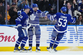 Toronto Maple Leafs' Auston Matthews (34) celebrates his goal against the Nashville Predators with Matthew Knies (23) and Easton Cowan (53) during third period NHL hockey action in Toronto on Tuesday, Oct. 14, 2025. (Nathan Denette/The Canadian Press via AP)