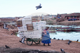 A woman pulls a cart with merchandise across the border to Peru from Desaguadero, Bolivia, Tuesday, Oct. 14, 2025. (AP Photo/Juan Karita)