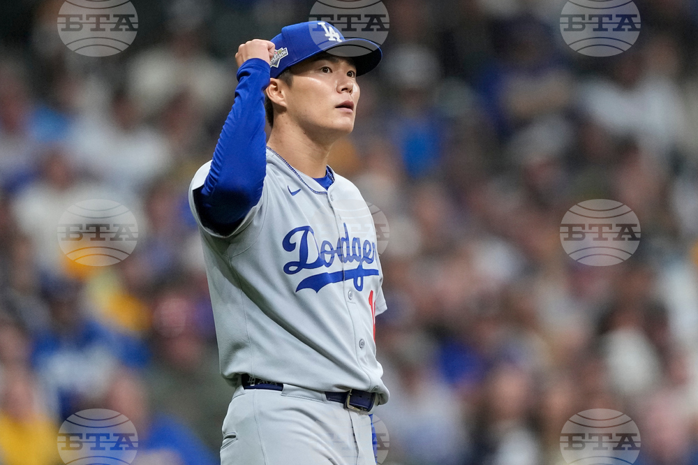 Los Angeles Dodgers pitcher Yoshinobu Yamamoto celebrates throwing a complete game against the Los Angeles Dodgers, in Game 2 of baseball's National League Championship Series, Tuesday, Oct. 14, 2025, in Milwaukee. (AP Photo/Ashley Landis)