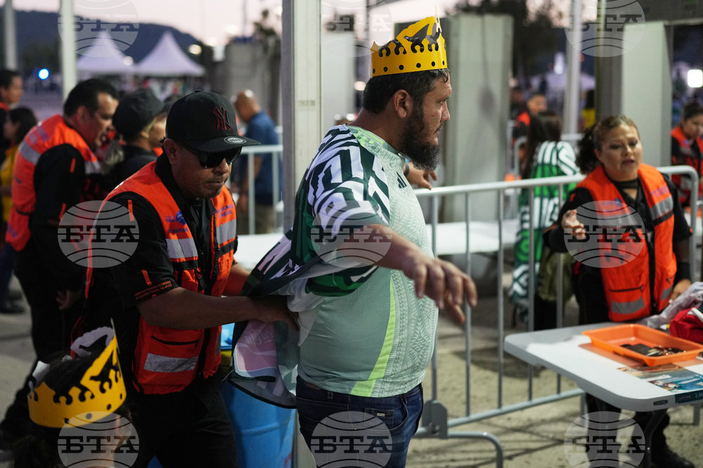 A security agent frisks a fan at Akron stadium prior to a friendly soccer match against Ecuador in Guadalajara, Mexico, Tuesday, Oct. 14, 2025. (AP Photo/Eduardo Verdugo)