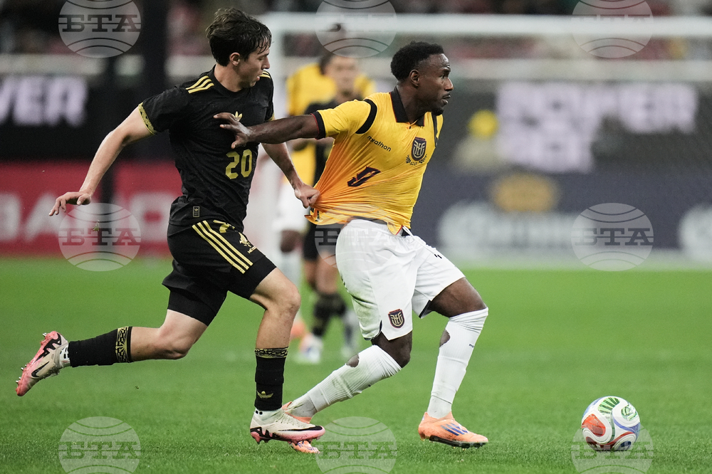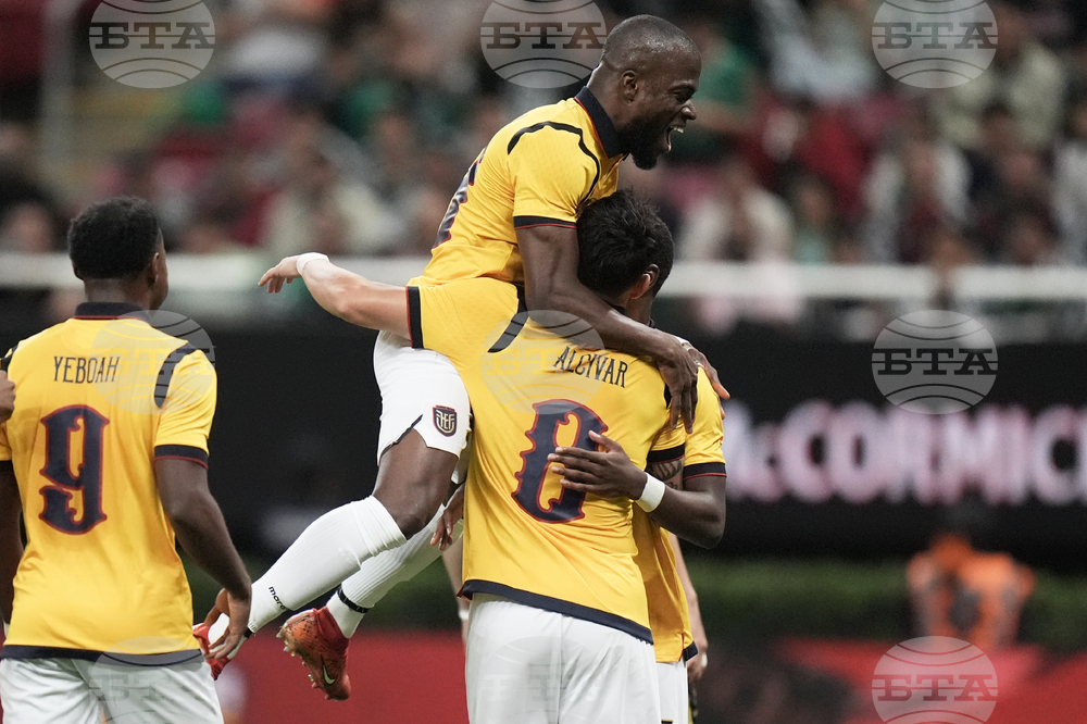 Ecuador's Enner Valencia, center, and Mexico's Johan Vásquez compete for the ball during a friendly soccer match at Akron stadium in Guadalajara, Mexico, Tuesday, Oct. 14, 2025. (AP Photo/Eduardo Verdugo)