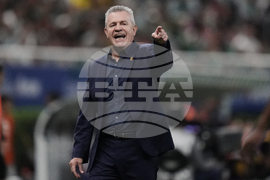 Mexico's coach Javier Aguirre reacts after Germán Berterame scoring the opening goal against Ecuador during a friendly soccer match at Akron stadium in Guadalajara, Mexico, Tuesday, Oct. 14, 2025. (AP Photo/Eduardo Verdugo)