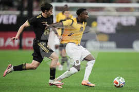 Mexico's Mateo Chávez, left, challenges Ecuador's John Yeboah during a friendly soccer match at Akron stadium in Guadalajara, Mexico, Tuesday, Oct. 14, 2025. (AP Photo/Eduardo Verdugo)