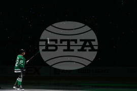 Dallas Stars center Mavrik Bourque is introduced onto the ice prior to an NHL hockey game against the Minnesota Wild Tuesday, Oct. 14, 2025, in Dallas. (AP Photo/Julio Cortez)