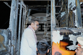 This photograph shared by Indian State Rajasthan Chief Minister's office shows Chief Minister Bhajan Lal Sharma inspecting a charred passenger bus after a suspected short circuit sparked a deadly bus fire near Jaisalmer, India, Tuesday, Oct. 14, 2025. (Rajasthan Chief Minister's office via AP)