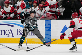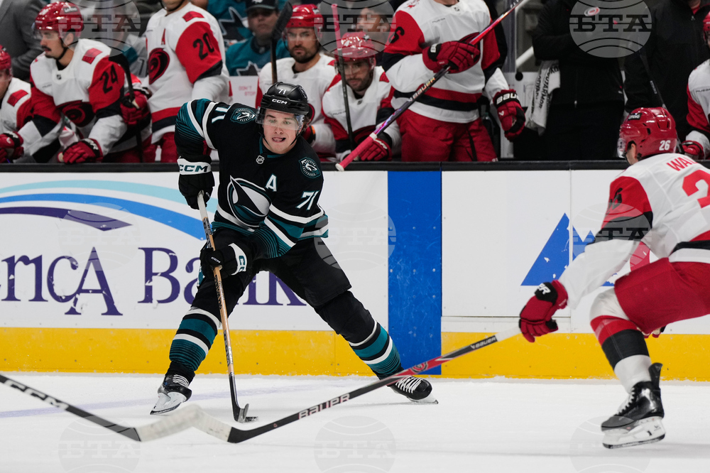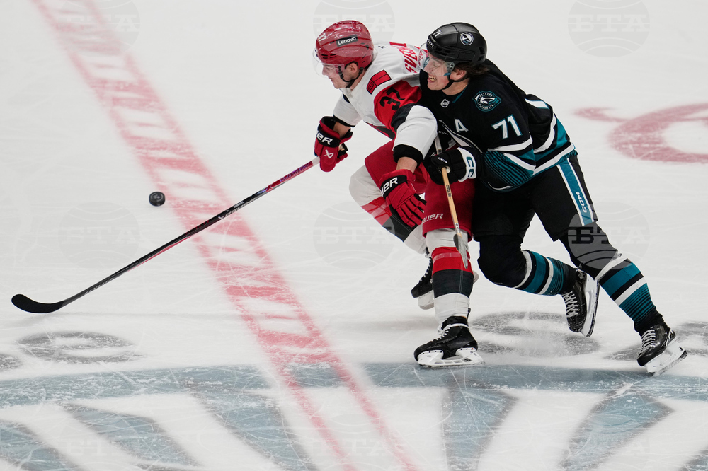 Carolina Hurricanes right wing Andrei Svechnikov (37) and San Jose Sharks center Macklin Celebrini (71) compete for possession of the puck during the third period of an NHL hockey game, Tuesday, Oct. 14, 2025, in San Jose, Calif. (AP Photo/Godofredo A. Vásquez)
