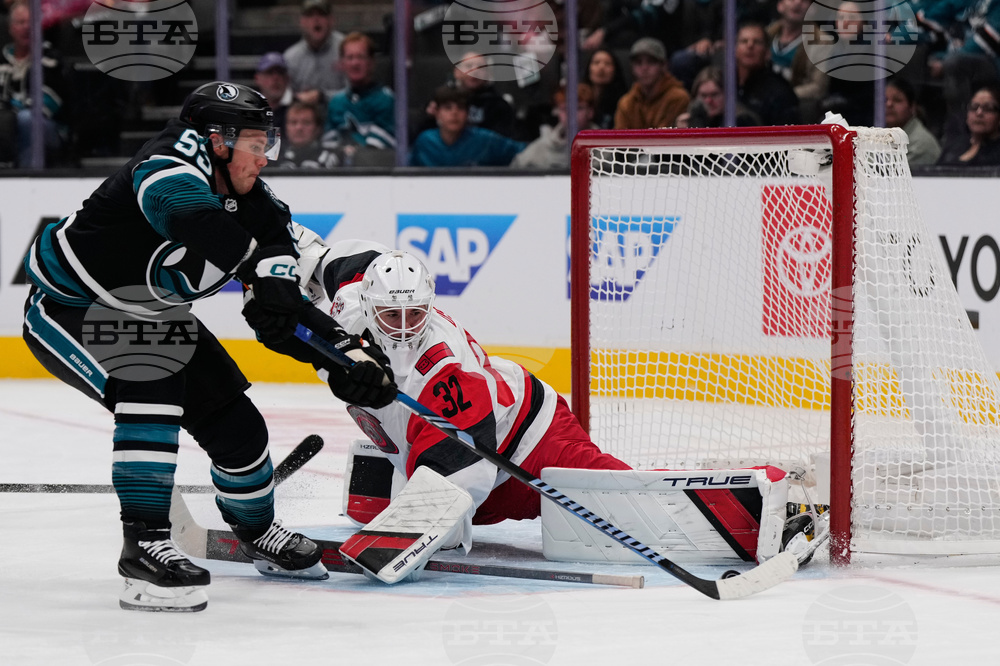 San Jose Sharks left wing Jeff Skinner, left, shoots the puck against Carolina Hurricanes goaltender Brandon Bussi during the first period of an NHL hockey game, Tuesday, Oct. 14, 2025, in San Jose, Calif. (AP Photo/Godofredo A. Vásquez)