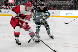Carolina Hurricanes defenseman Alexander Nikishin (21) and San Jose Sharks right wing Adam Gaudette compete for possession of the puck during the first period of an NHL hockey game, Tuesday, Oct. 14, 2025, in San Jose, Calif. (AP Photo/Godofredo A. Vásquez)