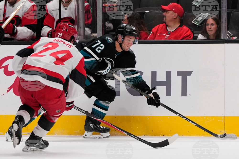 San Jose Sharks left wing William Eklund (72) moves the puck next to Carolina Hurricanes center Seth Jarvis (24) during the first period of an NHL hockey game, Tuesday, Oct. 14, 2025, in San Jose, Calif. (AP Photo/Godofredo A. Vásquez)